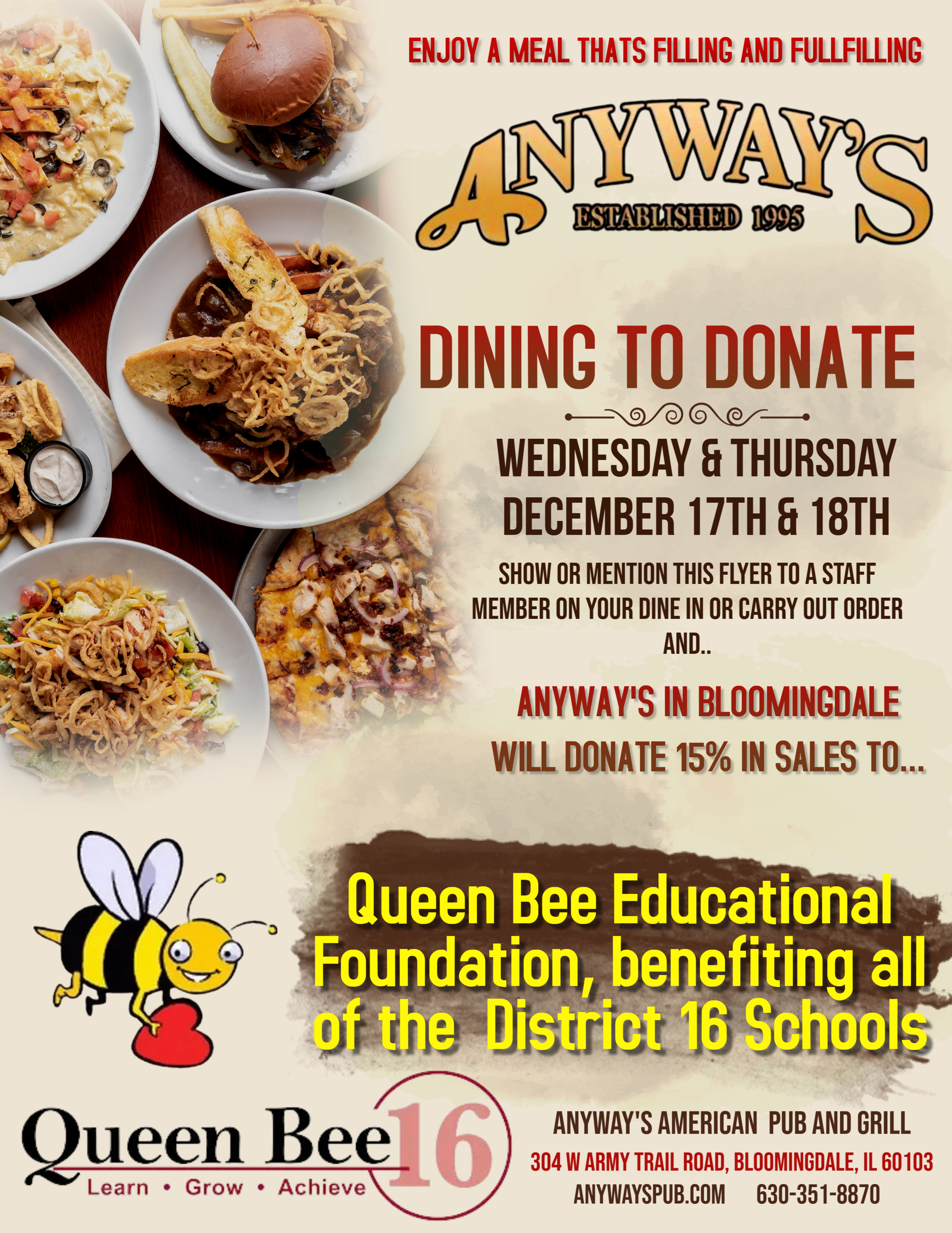 All Day-Two Days! At 304 W Army Trail Rd.,Bloomingdale! Show printed flyer or show on your phone when ordering. Dine-in or Carryout! Anyway's will donate 15% to QBEF |