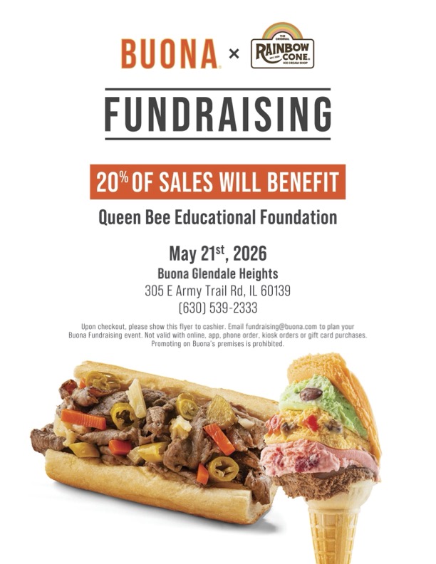 All Day 10:30-10:00 PM In Glendale Heights! Show printed flyer or show on your phone when ordering. Buona will donate 20% of your purchase to QBEF Not valid with online, app, phone orders, or Gift Card purchases. |