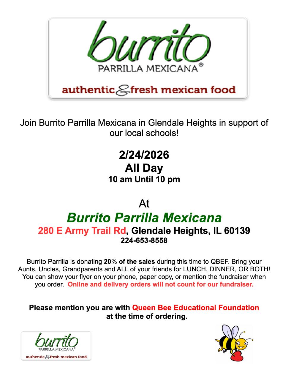All Day, 10 AM to 10 PM at 280 East Army Trail Rd. Glendale Heights Burrito Parrilla Mexicana will donate 20% of sales to QBEF Show paper flyer or image on your phone or mention QBEF when you place your order Not valid for online or delivery orders |