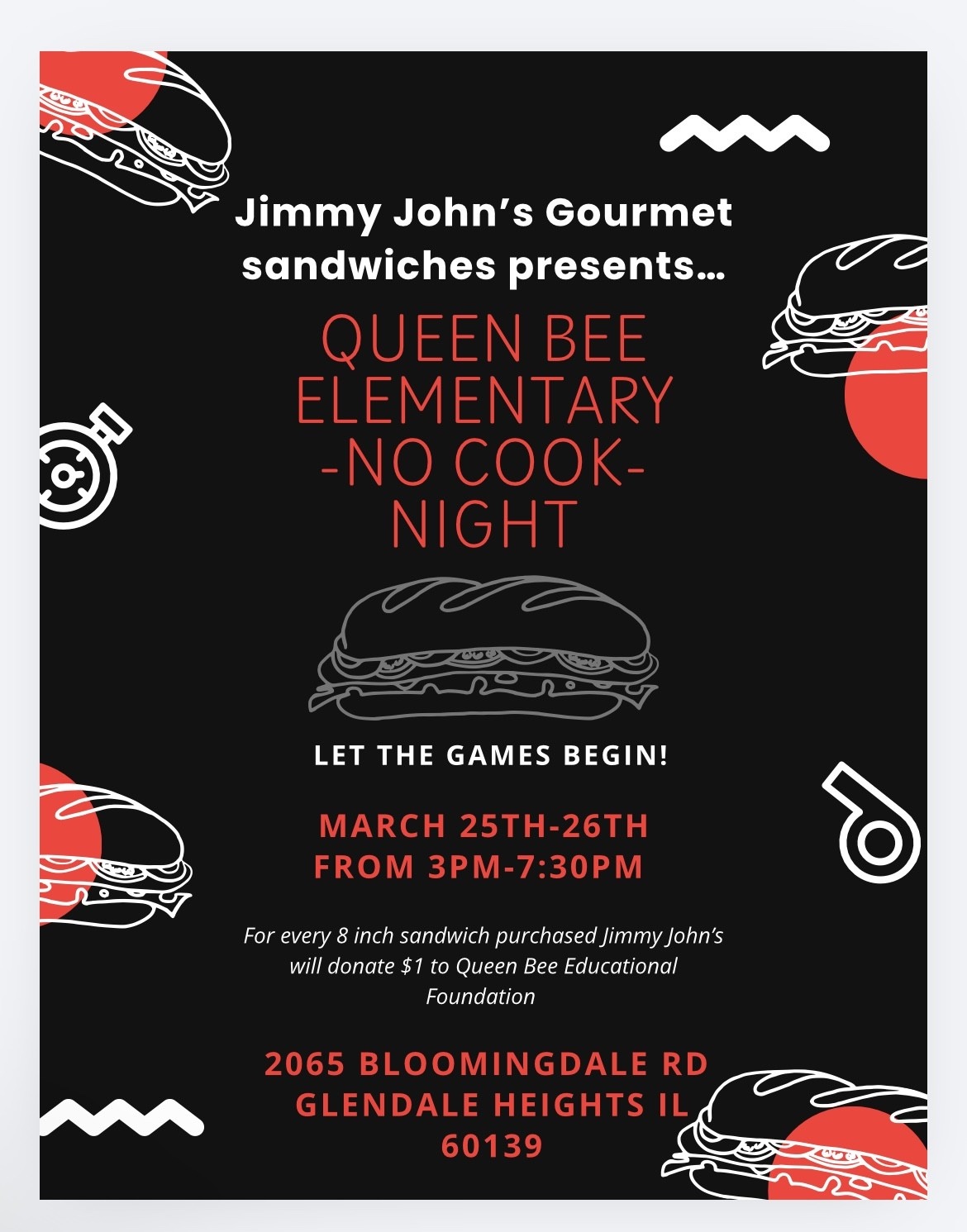 & Thursday 3/25-3/26/26 From 3 pm to 7:30 pm 2065 Bloomingdale Rd. In Glendale Heights Mention QBEF when ordering, or show paper flyer or on phone Jimmy John's will donate $1 to QBEF for each 8" sandwich purchased |
