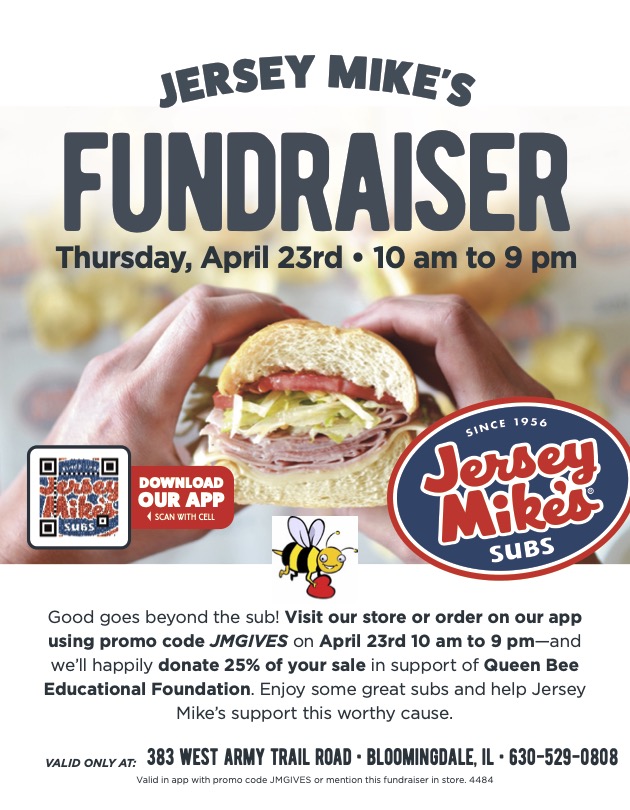 4/23/26 All Day 10 am to 9 pm In Bloomingdale 383 West Army Trail Road Suite 700 Jersey Mike's will donate 25% of proceeds to QBEF!! To participate digitally, order on the Jersey Mike App and use the promo code JMGIVES To participate at the restaurant, show the JPG flyer on your phone or paper form before payment |