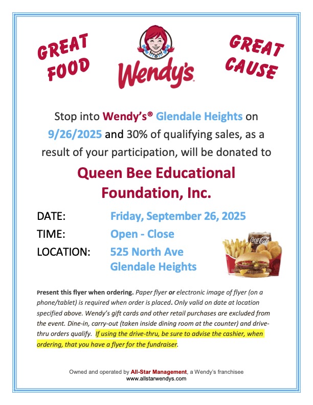 Glendale Heights, IL ALL DAY Wendy's will donate 30% of sales to QBEF! Show the paper flyer or JPG on your phone! If using the drive-thru, be sure to advise the cashier, when ordering, that you have a flyer for the fundraiser. |