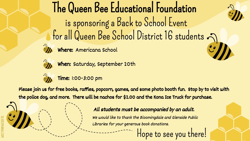 Queen Bee Educational Foundation, Inc. P.O. Box 5663 Glendale Heights, IL 60139-5663 www.qbef.org Benefitting Students of Queen Bee Elementary District 16 |